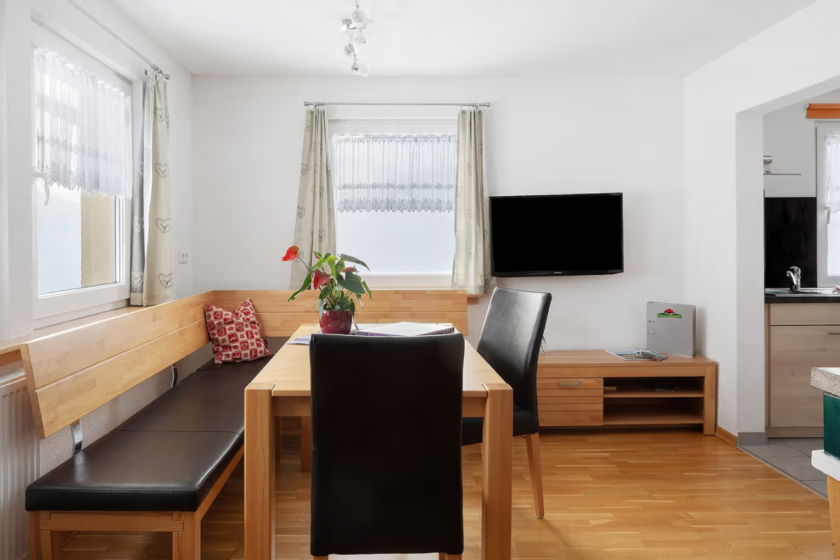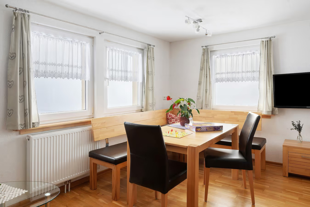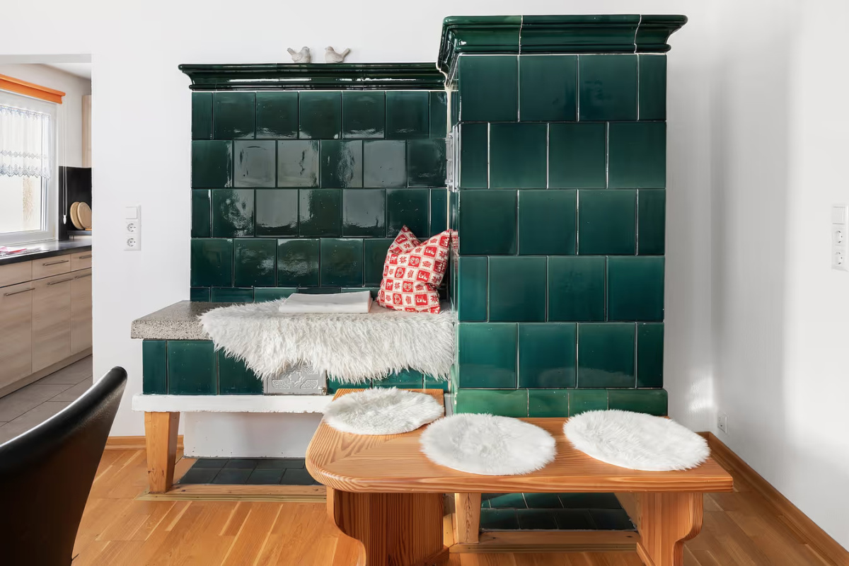 Das Schlafzimmer mit zusätzlichem Kinderbett sorgt für erholsame Nächte. Im gemütlichen Wohnbereich kann die Schlafcouch bei Bedarf als Schlafplatz für bis zu zwei Kinder genutzt werden. Für besondere Gemütlichkeit sorgt der Kachelofen, den wir gerne für Sie einheizen. Am großen Esstisch ist ausreichend Platz zum gemeinsamen Essen, Spielen und Beisammensein.
